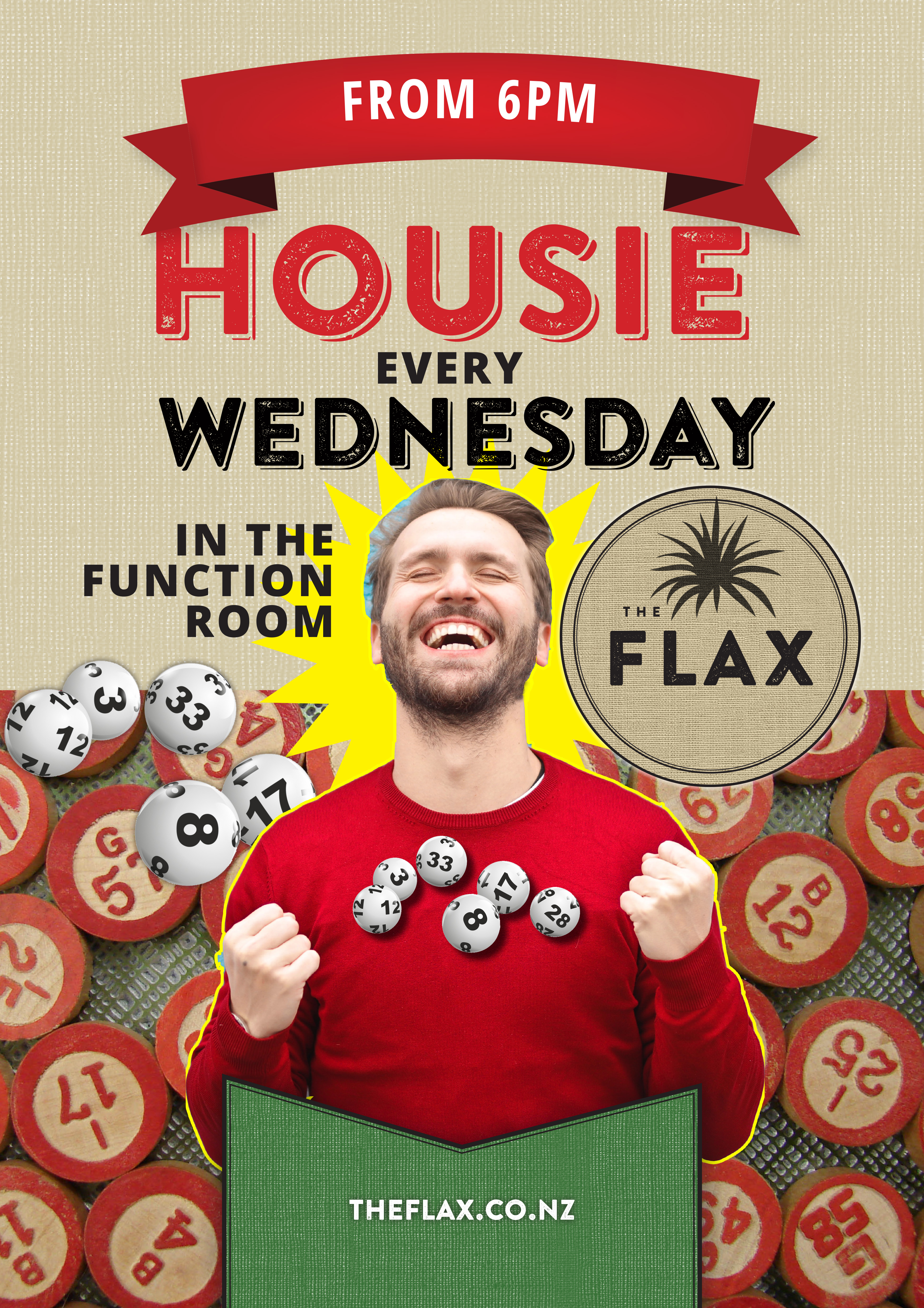 Don't forget to book your Christmas function! Call Raewyn now on (06) 873 9027 to secure a booking. Housie at the Flax every Wednesday from 6pm in the Function Room
